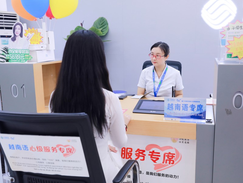 东兴市是中越边境口岸城市,中国移动广西公司还创新打造了跨境服务能力。中国移动北仑营业厅设立了全国首例越南语专席,并配备智能翻译设备,服务越南、柬埔寨等三千余外籍客户,为入境游客提供了极大的便利。越南客户阮女士赞叹:“营业员会说越南语,帮我解决了大麻烦。”2024年12月营业厅还创建了首个边境双语普法基地,融合中越法治宣传,赋能边境治理。目前,中国移动广西公司在东兴已建成5G基站291个,5G+MR覆盖率达99.2%,为中国—东盟商贸往来提供优质通信保障。