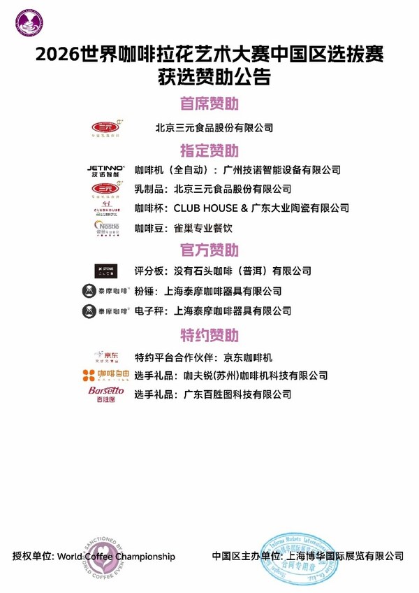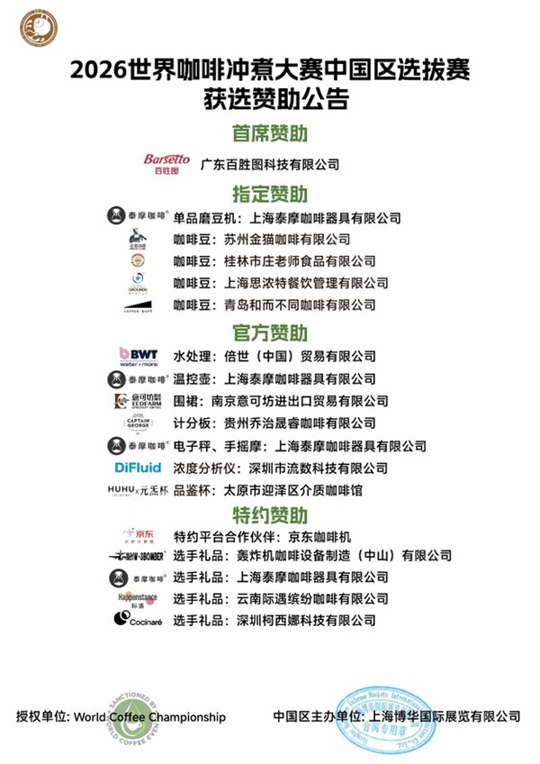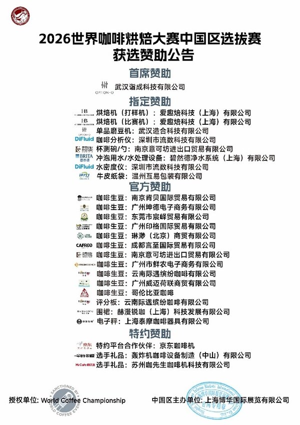 2026世界咖啡系列赛事中国区选拔赛&咖啡节赞助商招募结果出炉