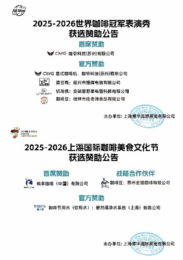 2026世界咖啡系列赛事、2025-2026世界咖啡冠军表演秀、2025-2026上海国际咖啡美食文化节赞助商招募结果正式出炉!他们将为赛事提供强大的支持和助力,共同打造一场咖啡界的盛宴!这不仅是对咖啡文化的推动,也是行业发展的重要一步。现将赞助商名单公布如下: