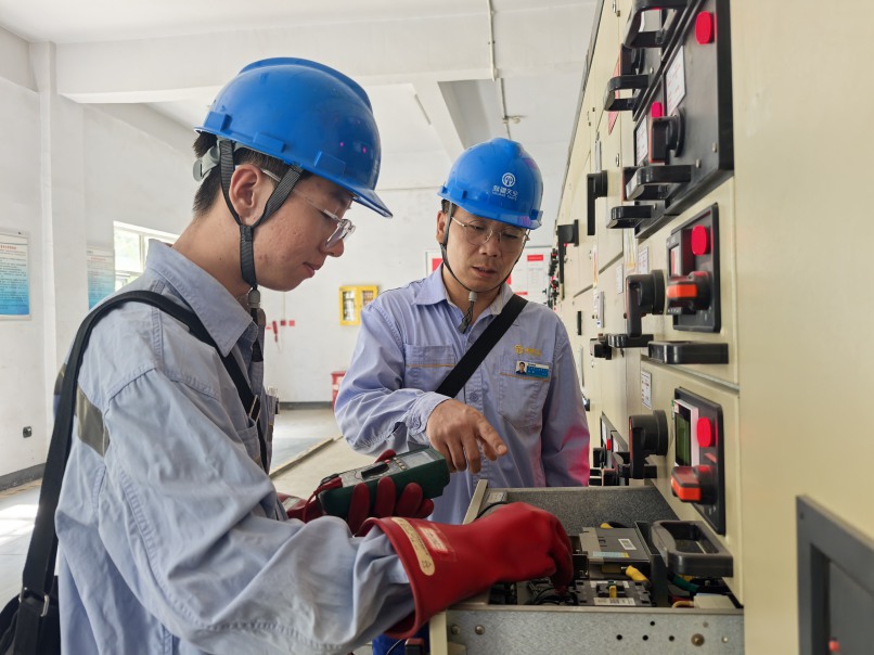 导言:近日,在天能化工有限公司,电气车间刘阳正带着青年员工李长寿在配电室内检查配电柜并为其讲解工作原理。