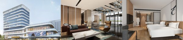从左至右(效果图):雄安万豪万枫酒店外观、大堂、客房
