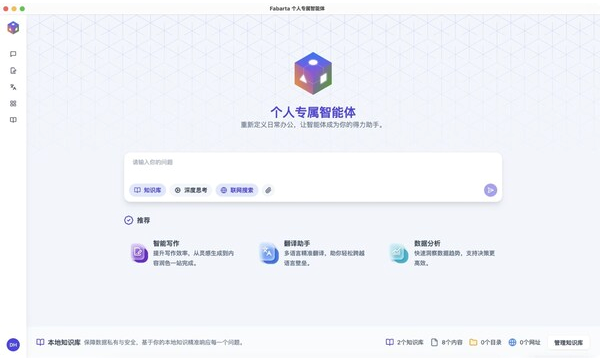 Fabarta个人专属智能体主要涵盖知识库问答、智能长文写作、数据分析、专业翻译等核心功能。