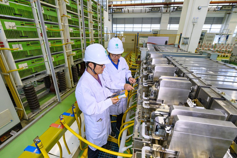 中国电科院科研人员开展柔性直流换流阀试验研究。