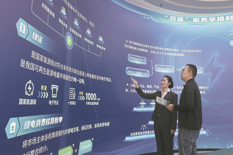 国网辽宁大连供电公司绿电绿证服务站员工为客户讲解绿电消费核算。