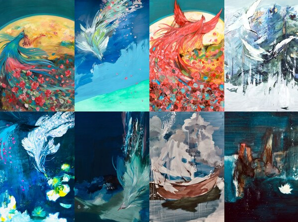 "涅槃凤影"艺术展以艺术家迟首飞最具代表性的《凤凰涅槃》系列画作为核心,呈现"浴火重生"的东方精神。作品以《凤凰涅槃》、《火凤》、《青鸾》、《彼岸花》、《松鹤图》、《白莲花》 《一叶菩提》等意象,将凤凰的炽烈与莲花的纯净、彼岸花的希望、松鹤的长青交织,一叶菩提的慈悲心展现给宾客,并传递"向死而生、生生不息"的深刻哲思, 也表达了"新生,希望及对美好未来的向往。
