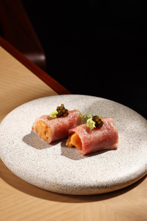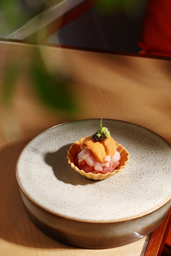 海胆和牛鱼籽酱塔塔 - 采用新鲜海胆、和牛薄片和鱼籽酱的三重组合,口感层次丰富。海胆的甜美、和牛的丰腴、鱼籽的微咸在口中交织,带来冰润爽滑的体验,每一口都像是海洋与陆地的味觉交响。