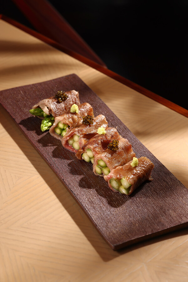 和牛芦笋卷 - 轻炙和牛片包裹脆嫩芦笋,肉汁渗入蔬菜纤维,口感丰富。牛肉的香浓与芦笋的清脆形成鲜明对比,每一口都像是在舌尖奏响交响曲。