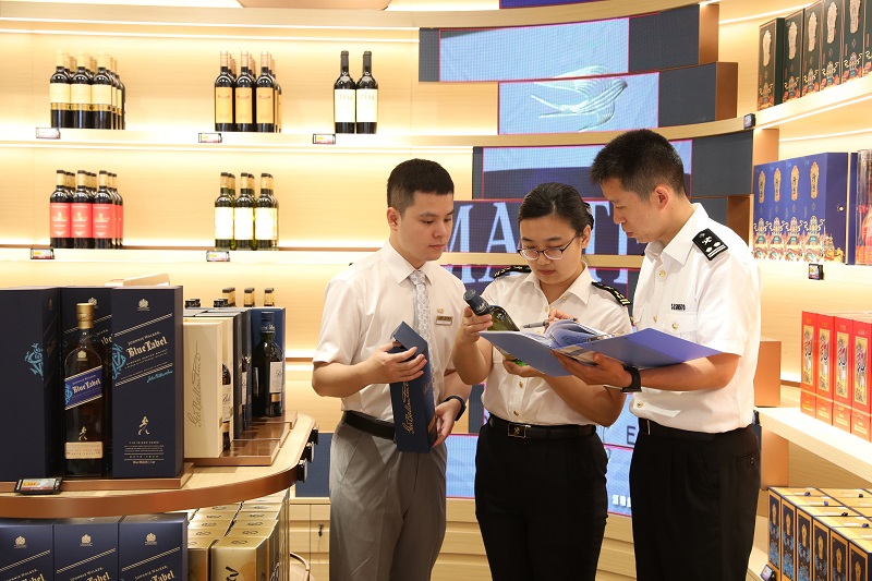图为:关员在清点市内免税店陈列的免税货物 关悦/摄