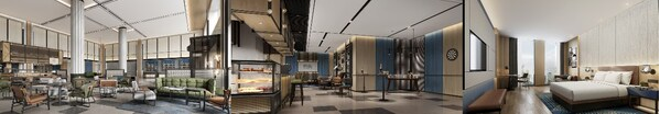 从左到右(效果图):昆山福朋喜来登酒店大堂、玩啤食社(The Mesh)、客房