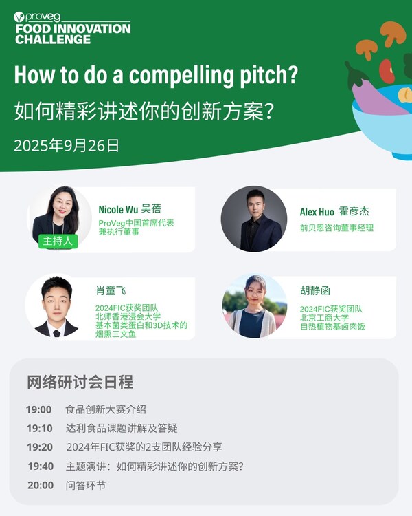 本届大赛面向中国籍在读本科生、硕士生、博士生以及未就业的应届毕业生开放,鼓励跨专业组队参赛(每队不超过4人)。为更好地帮助同学们准备参赛方案,ProVeg将在大赛期间举办多场网络研讨会,邀请专家开展专题讲座。同时,也欢迎学生团队主动邀请老师指导,以进一步提升方案的专业水准与可行性。