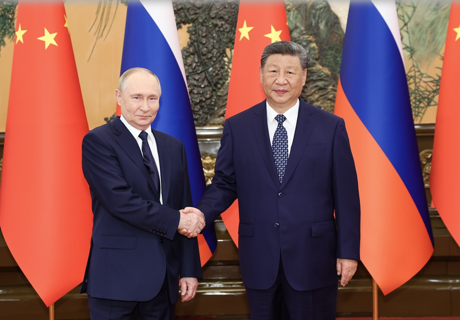 习近平指出,中俄两国元首相互出席对方国家举办的纪念世界反法西斯战争胜利庆典,充分彰显了作为第二次世界大战主要战胜国和联合国安理会常任理事国的大国担当,展示了维护二战胜利成果、捍卫正确二战史观的坚定决心。我提出全球治理倡议,就是要会同所有志同道合国家,坚定捍卫联合国宪章宗旨和原则,推动建设更加公正合理的全球治理体系。中俄两国都强调主权平等、国际法治、多边主义,要继续在联合国、上海合作组织、金砖国家、二十国集团等多边平台加强协作,携手推动构建人类命运共同体。
