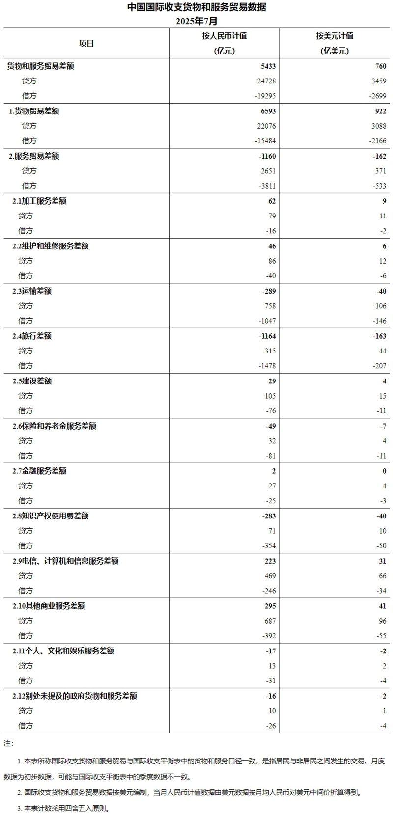 按美元计值,2025年7月,我国国际收支货物和服务贸易出口3459亿美元,进口2699亿美元,顺差760亿美元。