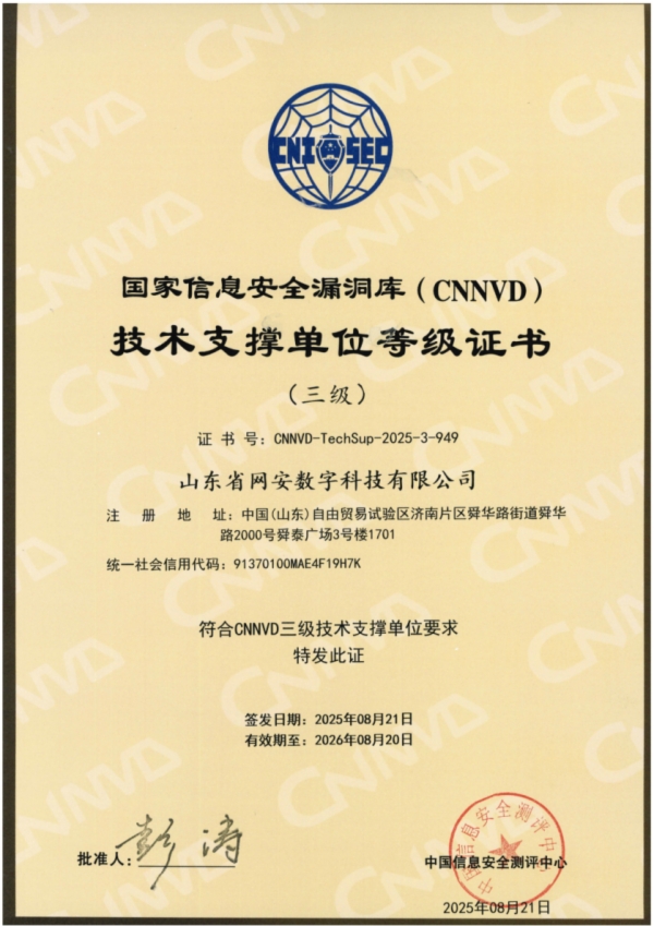 导言:近日,山东科创旗下网安数科成功通过国家信息安全漏洞库(CNNVD)的严格审核,正式获得“CNNVD技术支撑单位”资质。