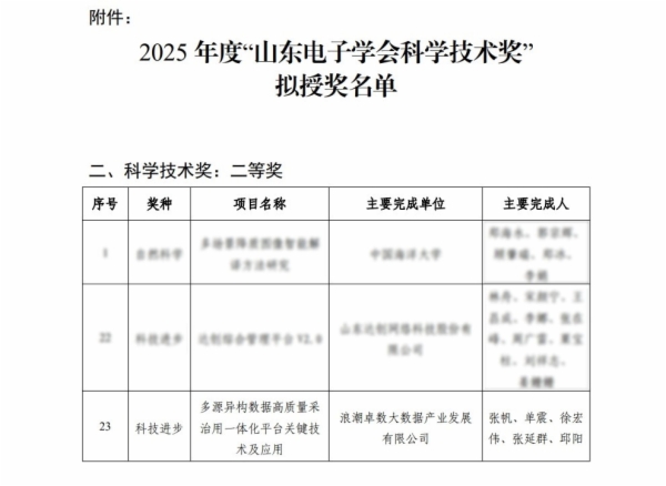 近日,2025年度“山东电子学会科学技术奖”获奖名单公布,浪潮卓数大数据申报的“多源异构数据高质量采治用一体化平台关键技术及应用”项目获评二等奖。
