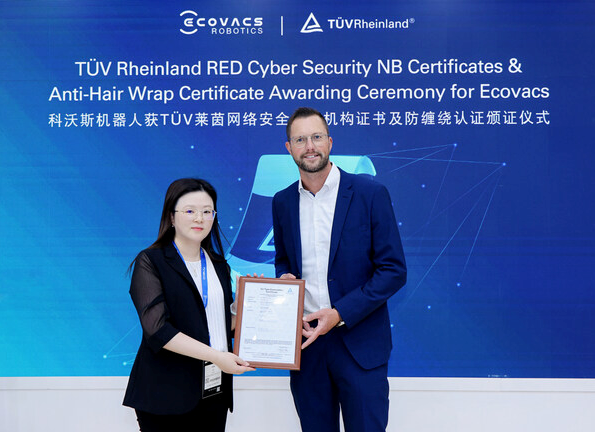 在IFA上,TÜV莱茵为科沃斯扫地机器人X11 颁发CE-RED网络安全相关法规公告机构认证(Notified Body)与"防缠绕"认证证书。