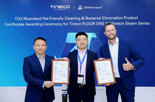 TÜV莱茵为Tineco智能洗地机FLOOR ONE S7 Stretch Steam Series颁发了"宠物友好清洁"和"除菌产品"双认证,展现了其在网络安全与清洁性能方面的双重优势。。