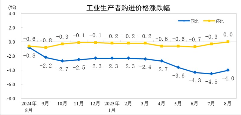据国家统计局网站消息,2025年8月份,全国工业生产者出厂价格同比下降2.9%,降幅比上月收窄0.7个百分点,环比由下降0.2%转为持平。工业生产者购进价格同比下降4.0%,环比持平。1—8月平均,工业生产者出厂价格比上年同期下降2.9%,工业生产者购进价格下降3.3%。