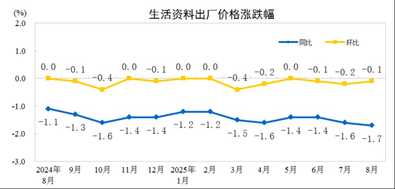 8月份,工业生产者出厂价格中,生产资料价格上涨0.1%,影响工业生产者出厂价格总水平上涨约0.08个百分点。其中,采掘工业价格上涨1.3%,原材料工业价格上涨0.2%,加工工业价格持平。生活资料价格下降0.1%,影响工业生产者出厂价格总水平下降约0.03个百分点。其中,食品价格上涨0.1%,衣着价格持平,一般日用品价格下降0.2%,耐用消费品价格下降0.3%。