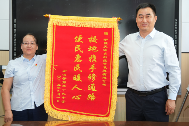“你们不仅畅通了孩子们的求学路,更守护了孩子们的安全,这面锦旗,请一定收下。”9月5日,天泽集团党委委员、副总经理王志刚一行应邀前往二十九中学,见面伊始,王丽便将一面刻有“校地携手修通路、便民惠民暖人心”的锦旗送给天泽集团,感激之情溢于言表。