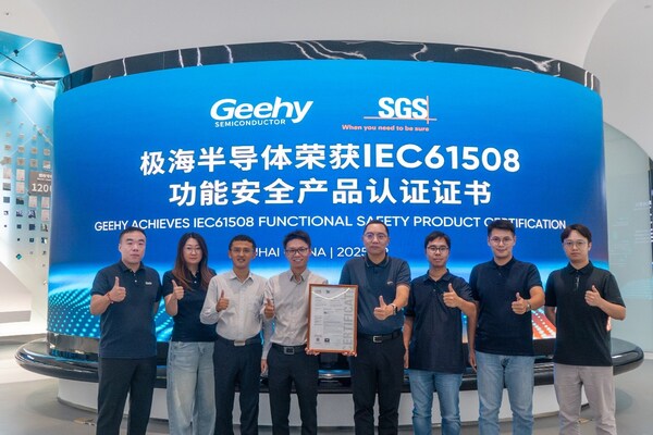 近日,国际公认的测试、检验和认证机构SGS为珠海极海半导体有限公司(以下简称"极海半导体")的G32R501系列MCU芯片颁发了SGS-TÜV SAAR IEC 61508 SIL 2功能安全证书。SGS中国区功能安全中心产品线总监郑峥与极海副总经理曾豪、实时控制MCU产品线负责人卢鹏升、市场部负责人张瀚月、产品认证负责人赵丰等双方代表共同出席本次仪式。