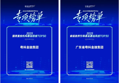 粤科金融集团获评“2025国资直投机构最佳回报TOP30”和“2025省级政府引导基金最佳风控TOP30”。