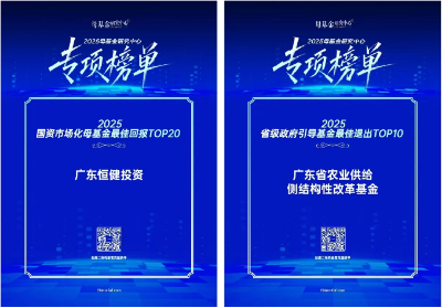 恒健控股公司获评“2025国资市场化母基金最佳回报TOP20”,旗下广东省农业供给侧结构性改革基金获评“2025省级政府引导基金最佳退出TOP10”。