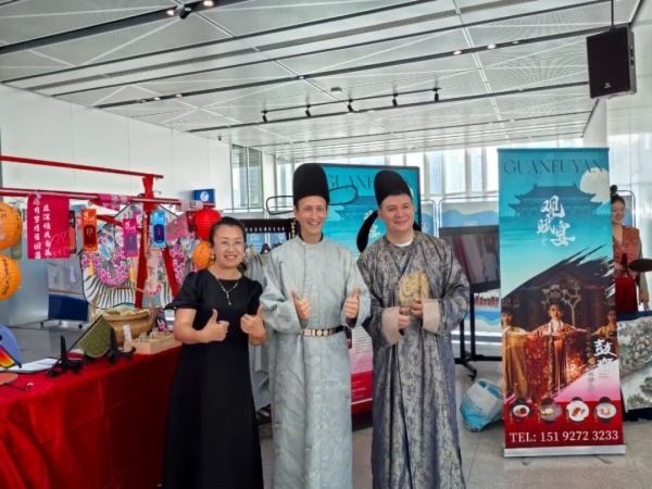 一旁的古筝演奏区,乐手指尖流转间,《高山流水》《春江花月夜》等经典曲目悠悠传出,与龙舞的热烈形成“动静相宜”的美感;身着汉服的表演者则迈着典雅步子穿梭在人群中,广袖飘飘、襦裙曳地,引得游客纷纷上前体验、合影。“像从古画里走出来一样!”一位美国游客笑着说。