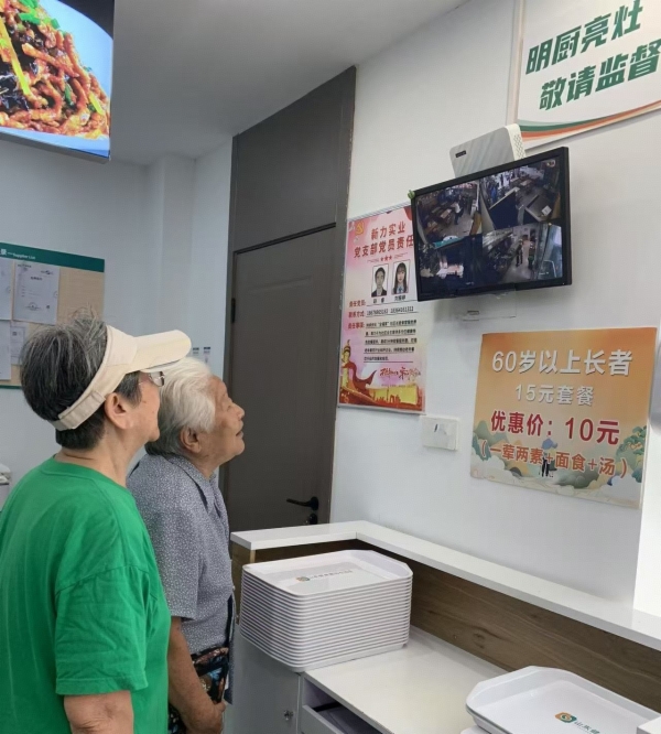 走进位于济南市市中区马鞍山路18号的“全福享”长者助餐食堂,干净整洁的就餐环境与色香味俱全的健康菜品相得益彰。大厅显著位置新增的显示屏上,正实时呈现厨房仓储、食材清洗、切配加工、烹饪制作等关键岗位画面,将后厨运作彻底“透明化”,吸引了不少老年顾客驻足观看。