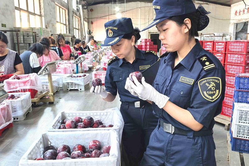 图为:关员对出口鲜李进行现场查验 徐一丹/摄