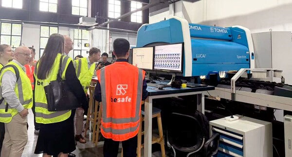 代表团还走进了陶朗昆山的生产车间实地考察,观摩分选设备生产线。大使表示,陶朗在挪威是国民品牌,陶朗的饮料瓶回收机伴随着挪威几代人的成长。然而,此次参访,陶朗在更广泛的食品分选和资源回收领域所达到的技术深度与全球影响力,让他更为印象深刻:熟悉的品牌带来了新惊喜。