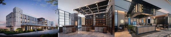 从左到右:西安大雁塔福朋喜来登酒店外观(效果图)、大堂、玩啤食社(The MESH)