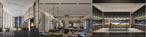 从左到右:烟台芝罘福朋喜来登酒店大堂、玩啤食社(The Mesh)、早餐厅