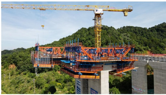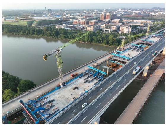 在施工工艺上,积极引入先进技术与智能装备,破解传统施工痛点。昌金改扩建项目在路面基层施工中引入速强免养生抗裂型水泥稳定碎石技术,铺筑完成仅24小时后,技术人员即可取出完整、密实的芯样,基层快速具备足够整体性和初期强度,显著缩短施工周期、提升工程质量;桥梁施工采用的新型桁梁式智能行走挂篮,凭借重心稳定、作业空间大、主桁架行走同步性强、轨道自动化前移等优势,有效解决传统挂篮易侧翻、结构受力不均、行走不同步等问题。