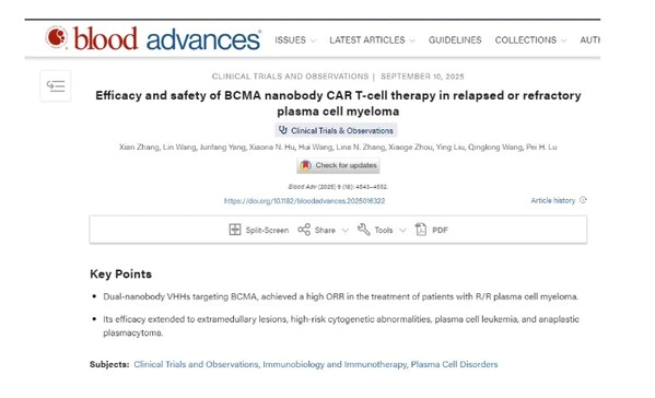 近日,国际血液学期刊Blood Advances杂志发表了陆道培医学团队一项前瞻性临床研究,张弦主任为第一作者,陆佩华院长为通讯作者,题为《Efficacy and safety of BCMA nanobody CAR T-cell therapy in relapsed or refractory plasma cell myeloma》(BCMA纳米抗体CAR-T细胞疗法在复发/难治性浆细胞性骨髓瘤中的疗效与安全性),报道了应用纳米体的BCMA CAR-T细胞治疗多线治疗后难治复发的浆细胞肿瘤的突破性临床研究成果。