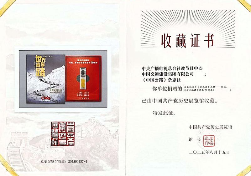 近日,由中央广播电视总台社教节目中心、中交集团、《中国公路》杂志社联合制作的五集纪录片《世界屋脊之路——川藏、青藏公路建成通车70周年》被中国共产党历史展览馆收藏。这是党史馆建馆以来颁发收藏证书的第一部纪录片,也是继大型情景史诗舞台艺术电影《伟大征程》之后颁发收藏证书的第二部影视作品。