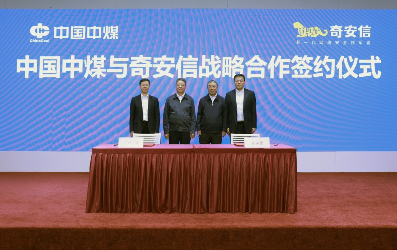 10月9日,中国中煤与奇安信集团在京签署战略合作协议。中国中煤党委书记、董事长王树东与奇安信集团党委书记、董事长齐向东举行工作会谈并见证签约。中国中煤党委常委、副总经理倪嘉宇,奇安信集团高级副总裁吴登峰分别代表双方签署协议。奇安信集团副总裁唐皓参加活动。