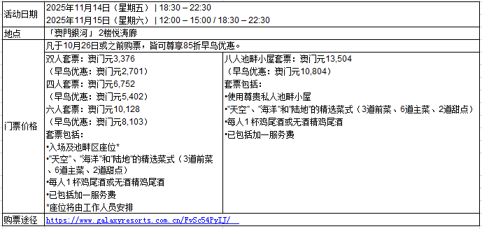 澳门引人入胜的美食盛会于11月14至15日星汇银河;于10月26日前购票可尊享早鸟优惠。
