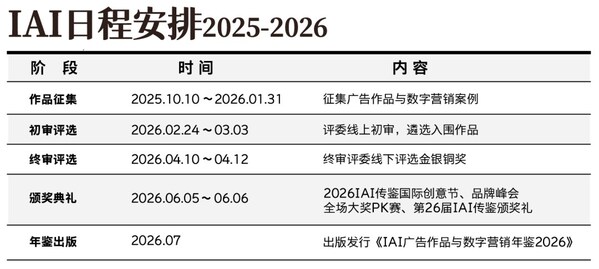 历经时代更迭,IAI以开放的姿态、专业的评审体系和国际化的视野,持续见证中国广告与品牌营销的成长轨迹。如今,它不仅是业界公认的权威综合类广告奖项,更是链接品牌、创意与社会力量的重要平台——让创意有迹可循,让品牌与时代同行。
