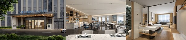 从左到右:杭州未来科技城万豪万枫酒店外观(效果图)、餐厅、客房