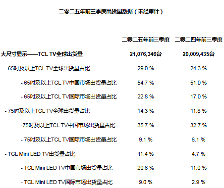 中国市场方面,受整体行业阶段性调整影响,虽然2025年前三季度TCL TV出货量同比下滑4.1%,但零售端表现仍然逆势跑赢行业,且零售量及零售额稳占市场前二[3]。与此同时,产品结构性增长动力依然显著,TCL Mini LED TV中国市场出货量同比大幅增长80.6%且其出货量占比同比提升9.6个百分点至20.6%,65吋及以上TCL TV出货量占比提升3.7个百分点至54.7%,75吋及以上TCL TV出货量占比同比提升3.0个百分点至35.7%。今年前三季度TCL TV在中国市场销售均价同比提升3.4%,其中第三季度销售均价同比提升8.1%。