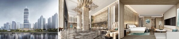 从左到右(效果图):宜昌威斯汀酒店外观、大堂及客房