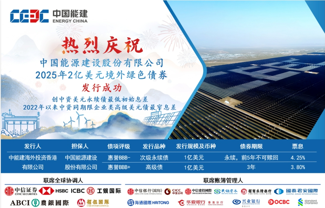 导言:由中能建海外投资香港有限公司作为发行人、中国能源建设股份有限公司担保的2亿美元绿色境外债券,在香港成功簿记,成为2025年非金融类中央企业的首单次级永续债和高级债,并创下中资美元永续债最低初始息差、2022年以来同期限企业类高级美元债最窄息差两项市场纪录。