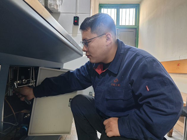 后盖开启的瞬间,机器预工作产生的热浪扑面而来。王加文率先戴好头灯,钻进仅容一人出入、不足三立方米的维修口。在密如蛛网的电线与管道间,他借着头灯微光小心摸索,精准定位到受损高压管。室外寒风刺骨,设备内部温度却高达40℃。他奋力松开35毫米的管口螺母,汗水很快浸透冬装,在狭小的空间内作业,脑袋也不慎磕出一个包。
