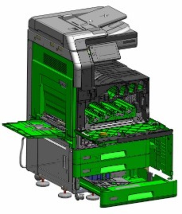 Apeos 3561/3061/2561机身前盖和纸盘等部件均采用再生塑料,配置4纸盘和自动双面输稿器机型使用回收塑料的总重量占比15%,富士胶片商业创新通过提高每个部件的强度、硬度以及抑制难以成型的再生塑料外观颜色质量差的方法保障产品质量。此外,秉承一贯的产品设计原则,系列新品在设计初期就兼顾了面向未来的回收与再利用等需求,从产品部件形状到结构都融入了易于拆卸、分类和清洁的设计。