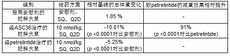表1. 在经过7天治疗的DIO大鼠中,ASC36的减重效果显著优于petrelintide,且差异具有统计学显著性
