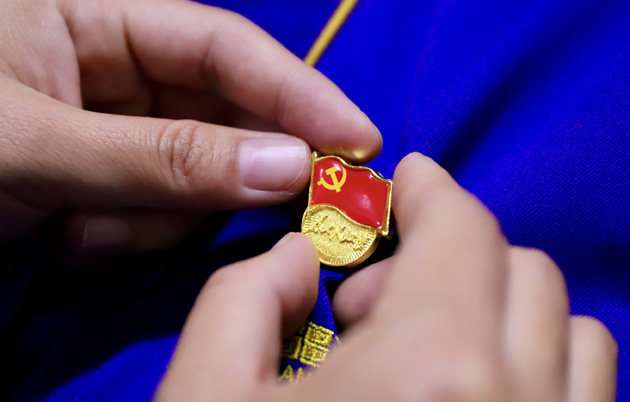 在佩戴党员徽章环节,新发展党员逐一佩戴党员徽章,一枚枚闪耀的徽章,既是荣誉的象征,更是责任的嘱托。全体党员面向鲜红的党旗,举起右拳,庄严宣誓,以铮铮誓言表达坚定不移听党话、跟党走的信念和决心,以实际行动践行对党的忠诚。